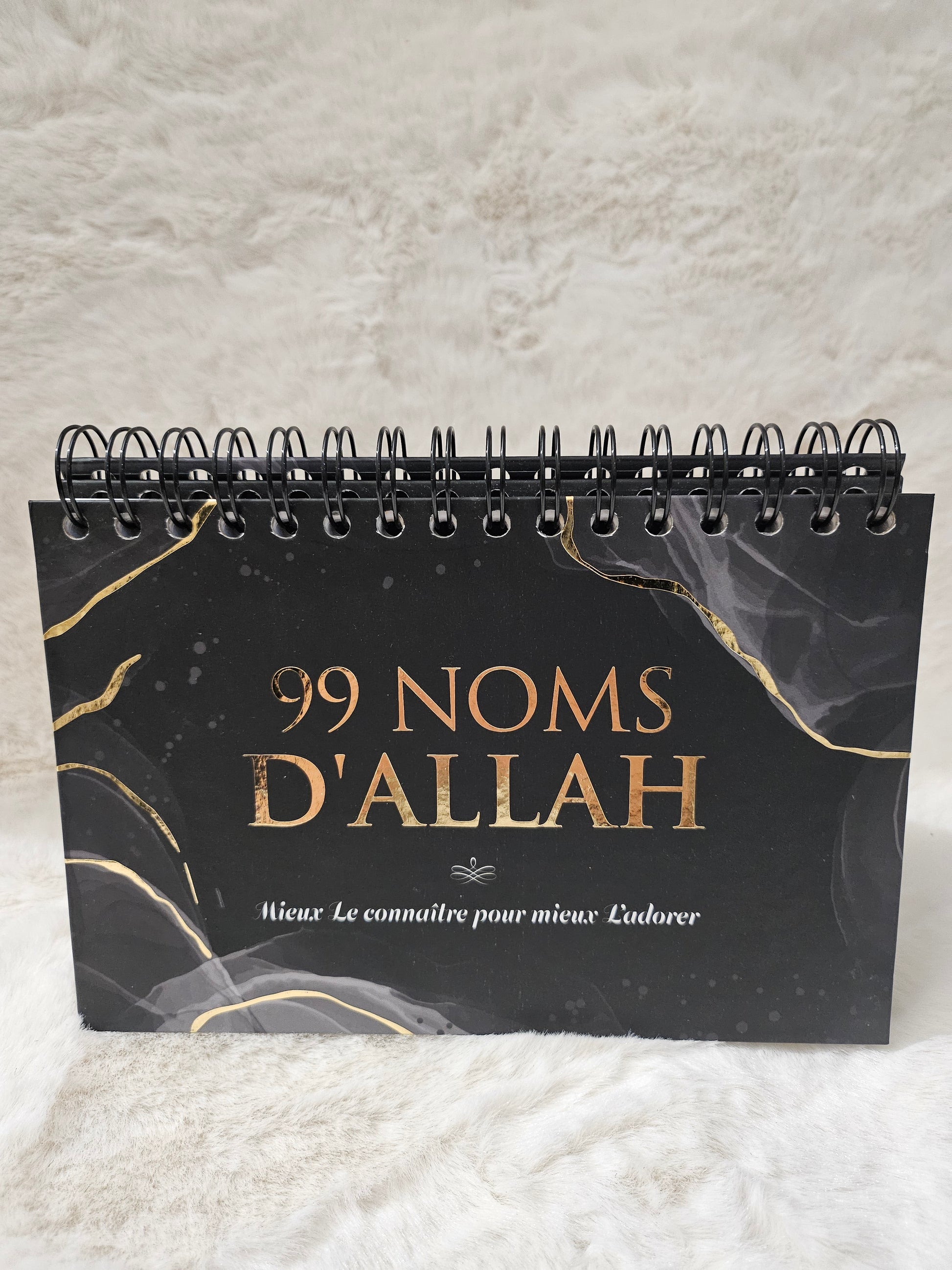 Calendrier chevalet noir des 99 noms d'Allah ; couverture cartonné avec dorure.