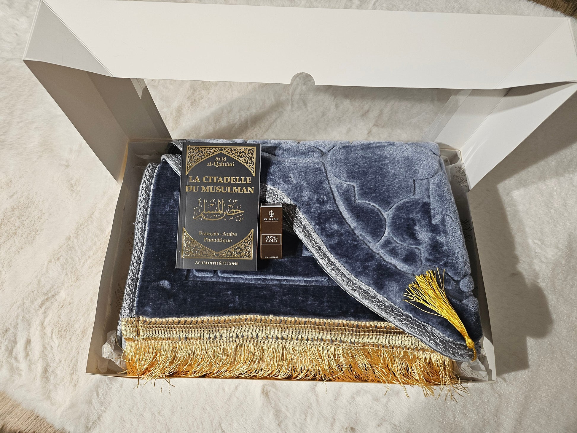Magnifique tapis de prière en forme de Mirhab, épais et confortable avec la partie du bas dorée et joli pompon en haut.