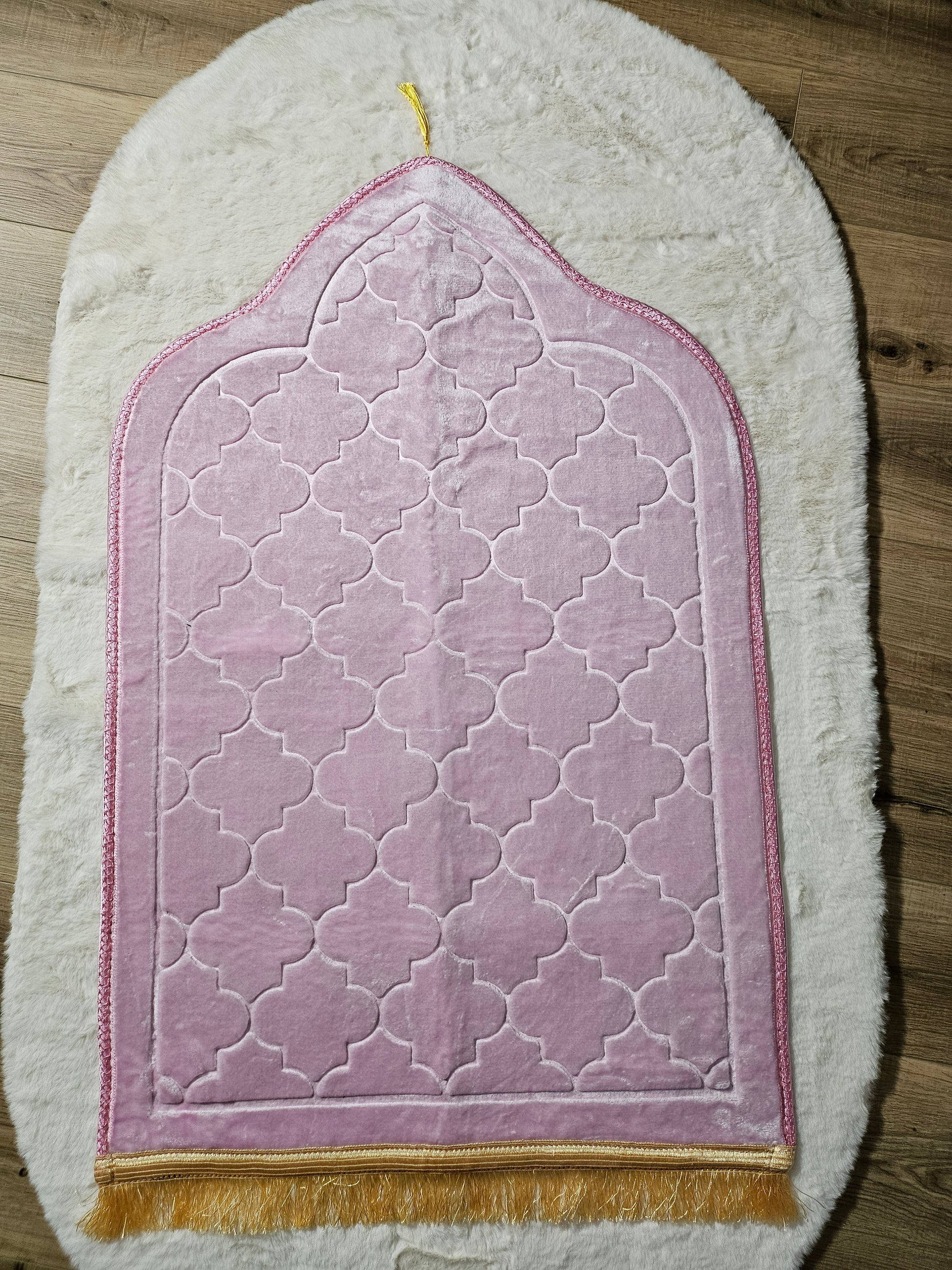 Magnifique tapis de prière en forme de Mirhab, épais et confortable avec la partie du bas dorée et joli pompon en haut.
