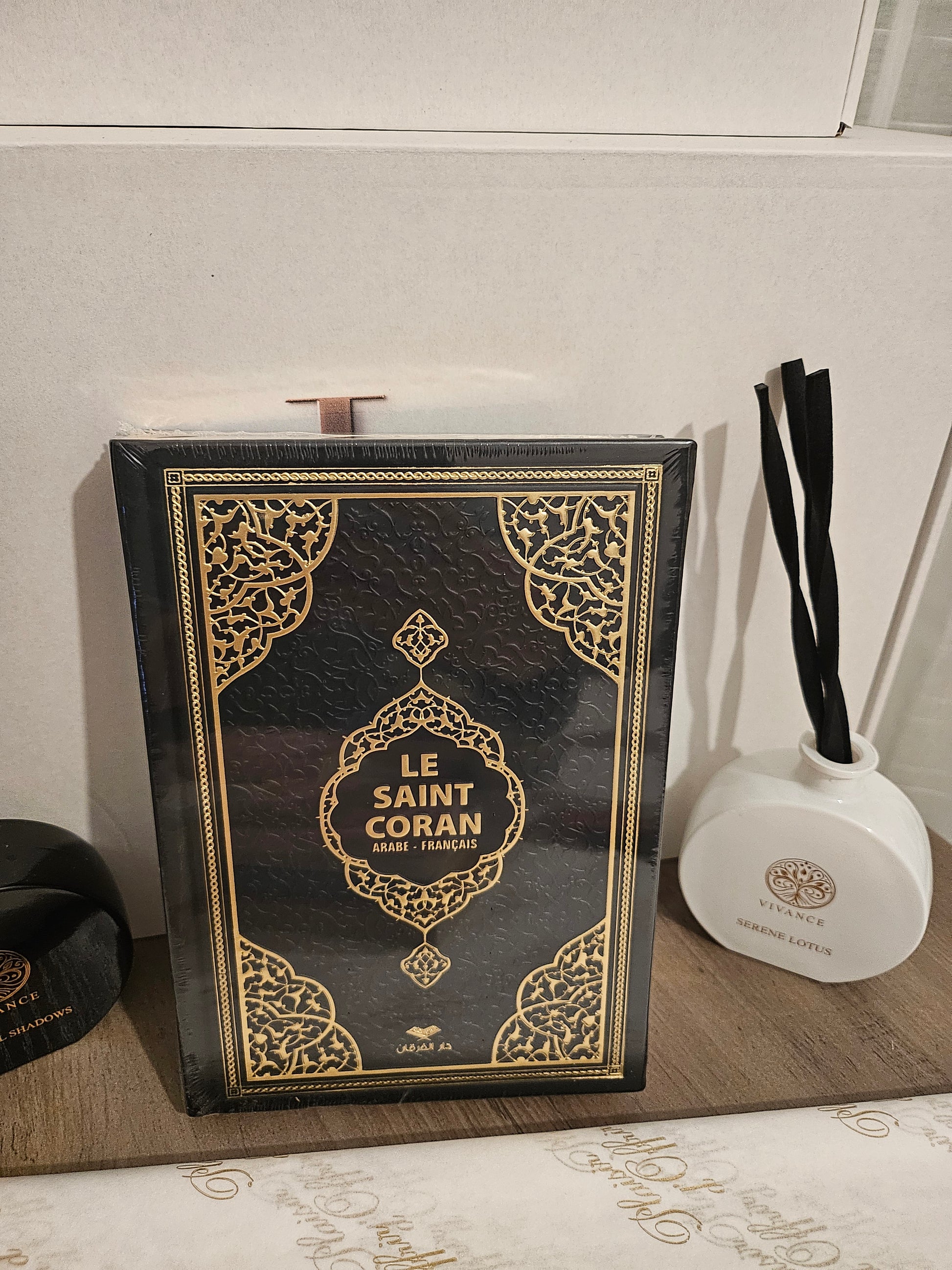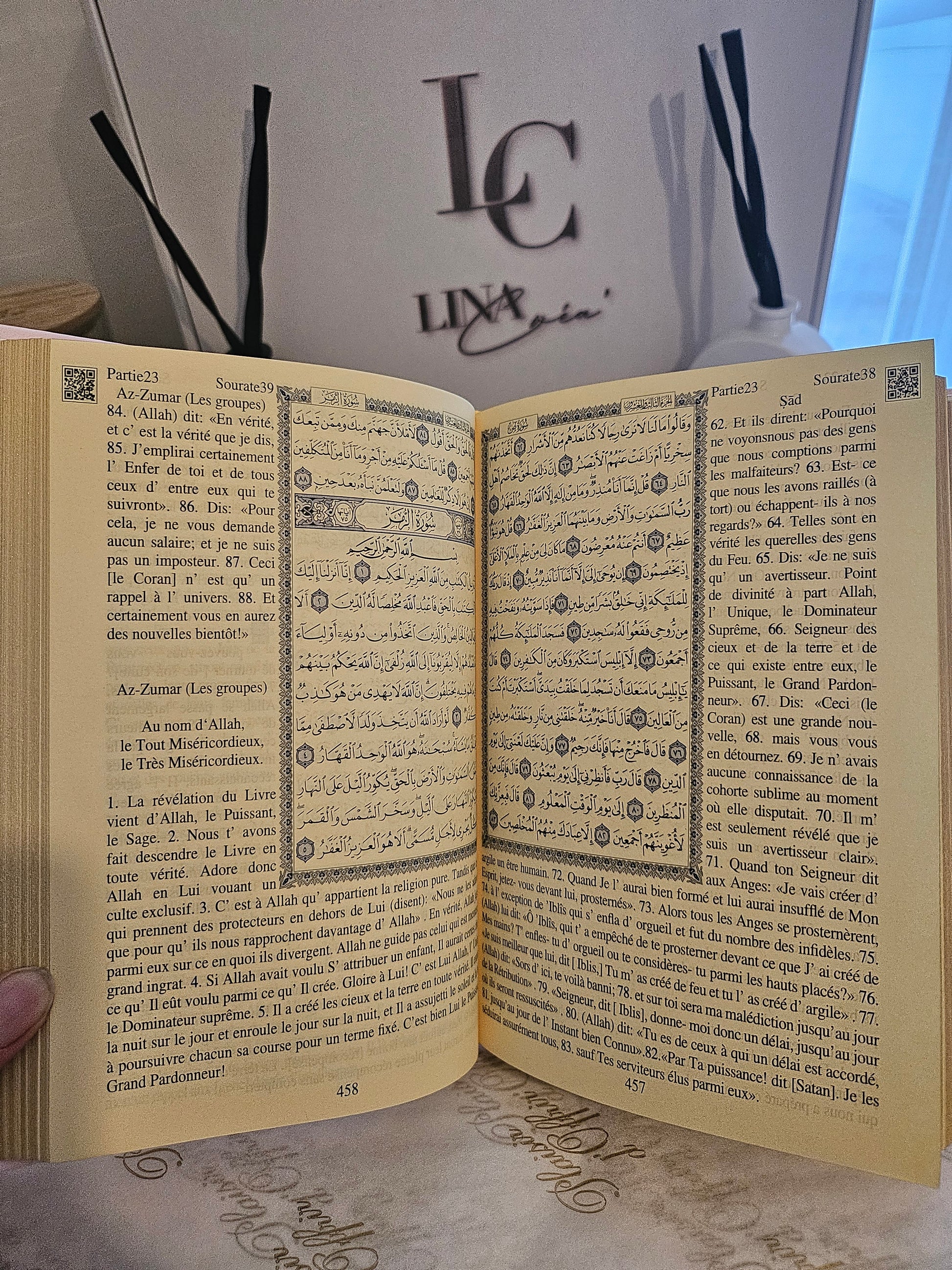 Très joli Coran Arabe/Français et ses bordures en dorées et son QR Code sur chaque page pour écouter la récitation en ligne.
